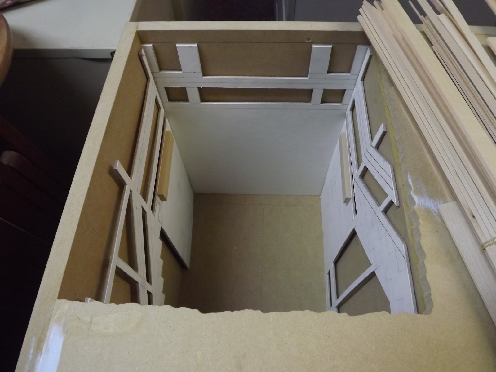 The first step is to build a frame with 1/4 inch basewood. In the past I built them free standing, but this time around I was lucky enough to be able to built them right onto the illustration board inner wall.
