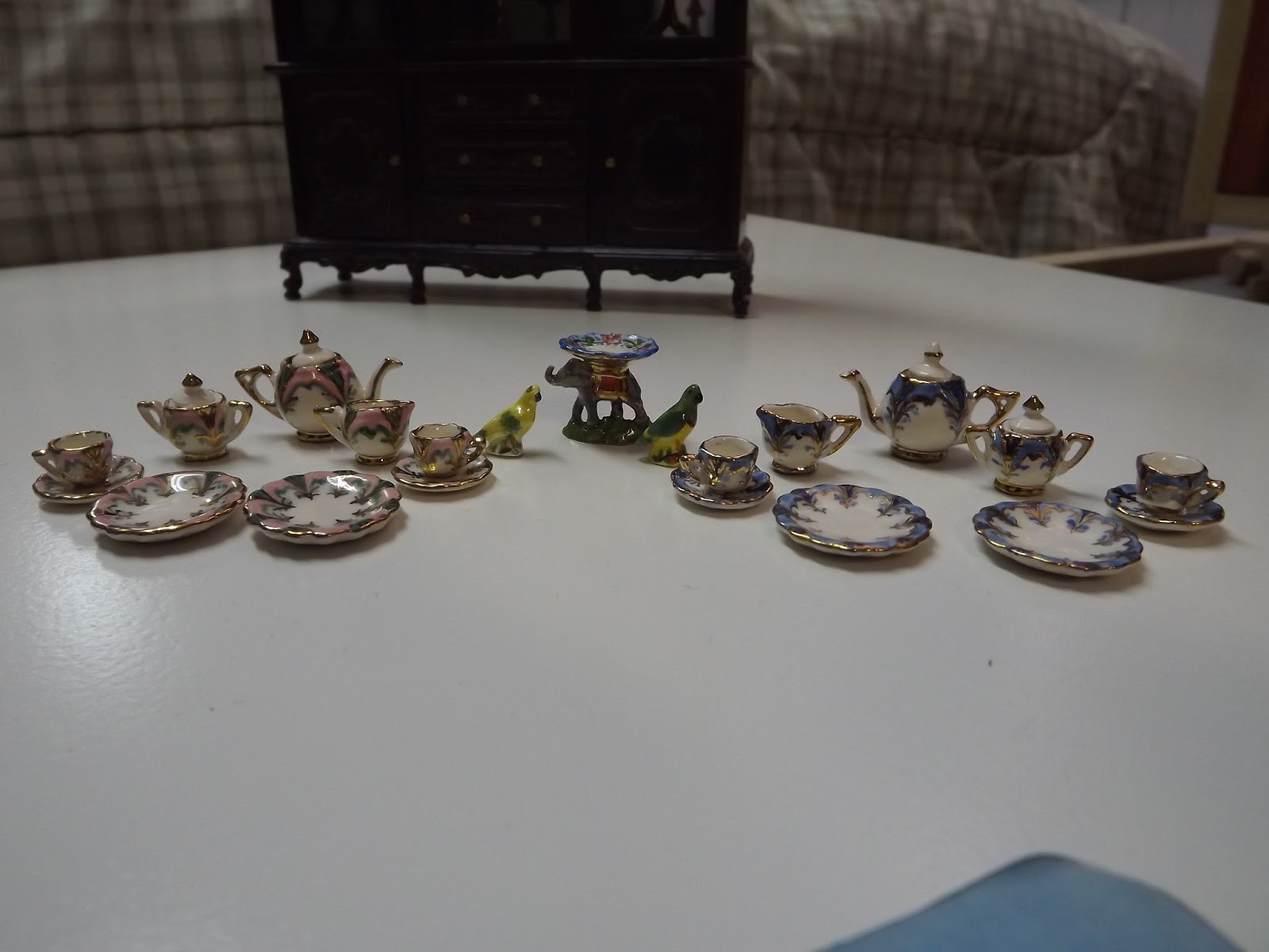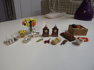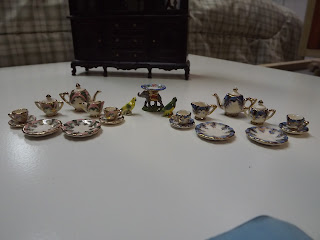 I used the same table and displayed the Imperial cherry blossom dinner set I commissioned from Julie at Westwinds miniatures a while ago. The gorgeous flower arrangement was made from Martha Mclean. I think I need better cutlery though.