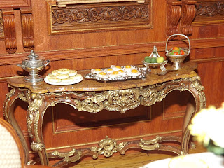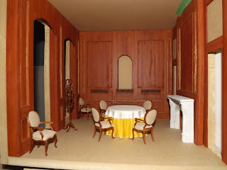 I know many of you really liked the first breakfast room. Don't worry Elizabeth, it is safely tucked away and I plan on using it as a room box. I loved the room, but several things really bothered me. Firstly, the space was tight and people could not walk around the table if others were seated. Secondly, Betsy, you were right, seeing the room only through the doors and windows was driving me crazy. It was impossible to see all the detail. Thirdly, there was not enough wall space for a decent sideboard and servers. The room was originally going to be a loggia...