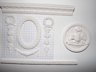 I had to cover large gaps with wood filler, re-carve the detail in the cornice to the best of my ability, paint it white (picture above) and re-paint the gold highlights.