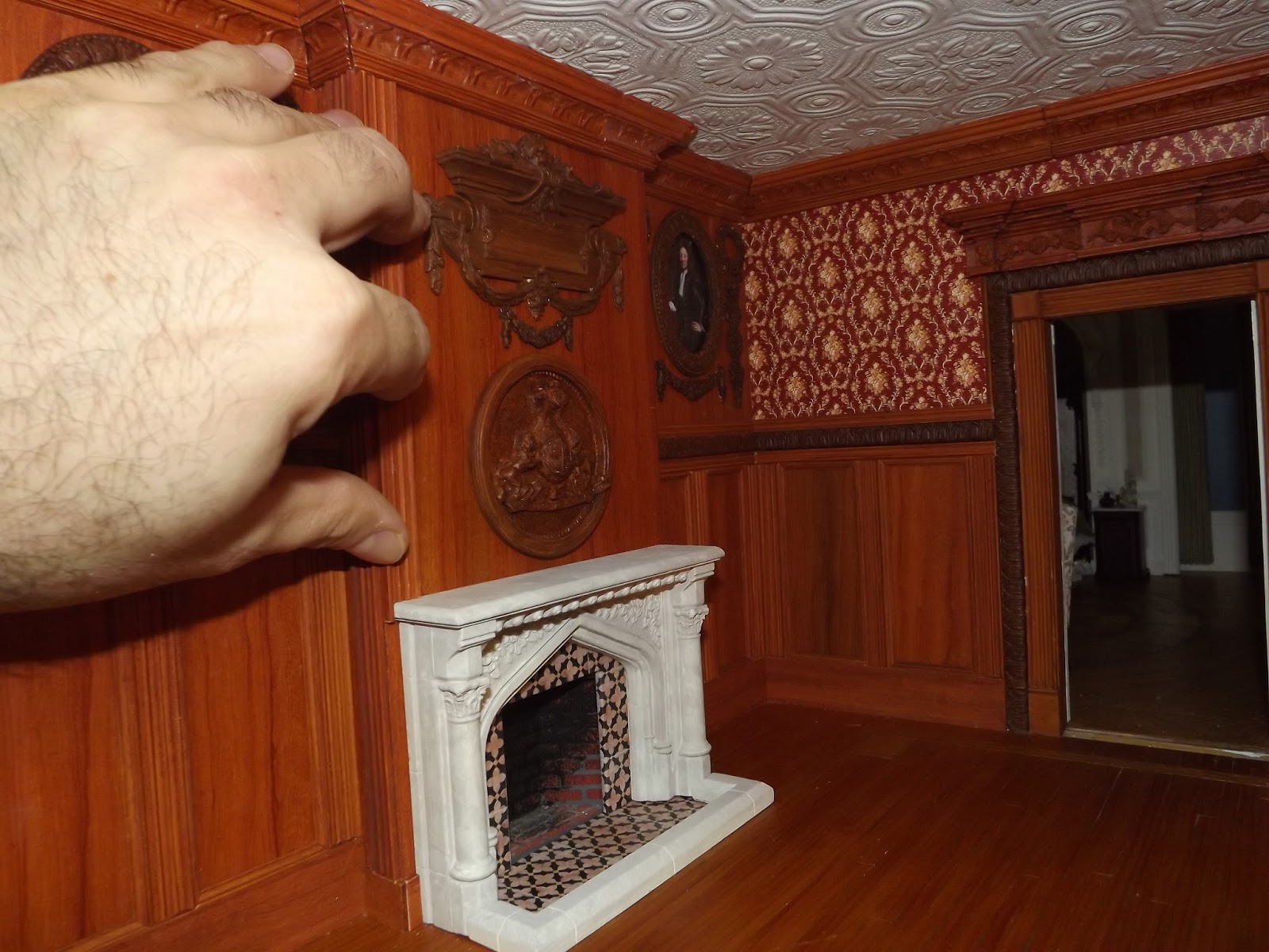 The fireplace wall gave me a hard time. Originally I cut out an opening for symmetry ans was going to make a closet. I realized I didn't like that...of course I realised this after it was glued in and the ceiling cornice was in place! I cut and tore off the right side of the fireplace wall and recut a new one, this time creating a built in shelf. I put it in place and realised the shelves would only be 5/8 in deep. Not terrible, but not right in a room this size. Finally I cut another piece and just added a lacquer chinoiserie panel.