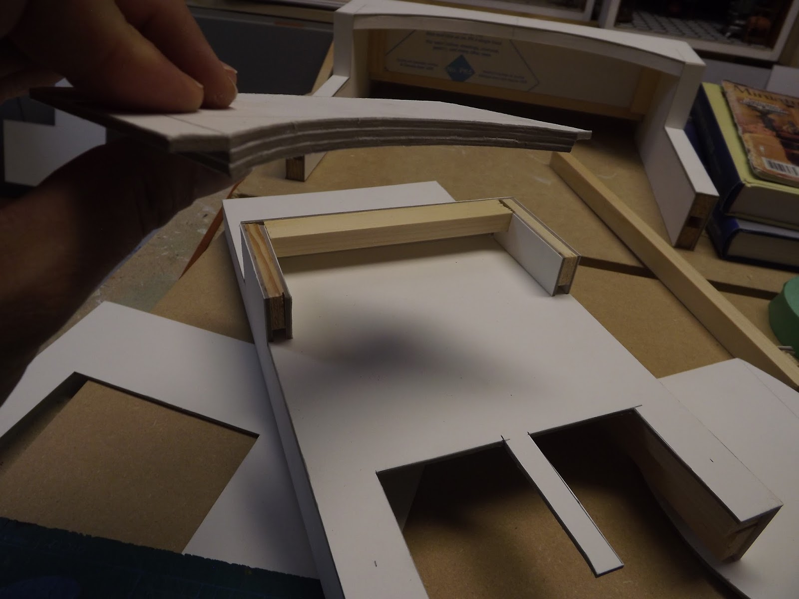 I added a back to the arch structure and then angle pieces so it would look more realistic when seen from underneath. The oven chimney had a smaller arch which did not protrude as much into the room, so I made it by gluing together 3 layers of the illustration board. that made is very solid and not too thick.