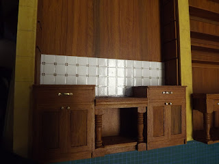 Sussex Crafts as were all the handles for the kitchen. Once again I used leftover newel posts for the sink base and drilled holes for the plumbing. I used the same laminated cardboard tile for the backsplash that I used for the cooking range.