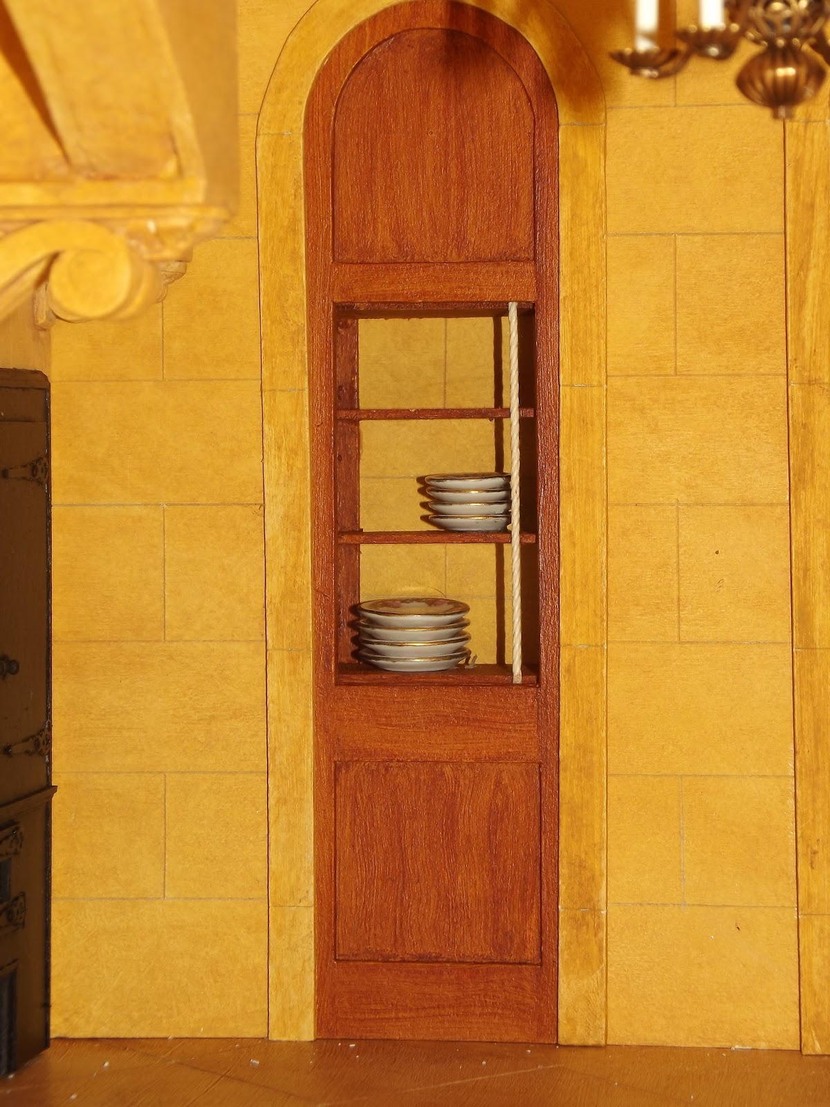 This enabled me to make a removable section so I could install my china outside of the manor then slide it in place. I try to not make opening doors because they always seem to come undone or get pulled out by visitors. The unit was really snug in the arch so I did not have to come up with a system to hold it in place like the last time. I just built a shelf for the unit to sit on.