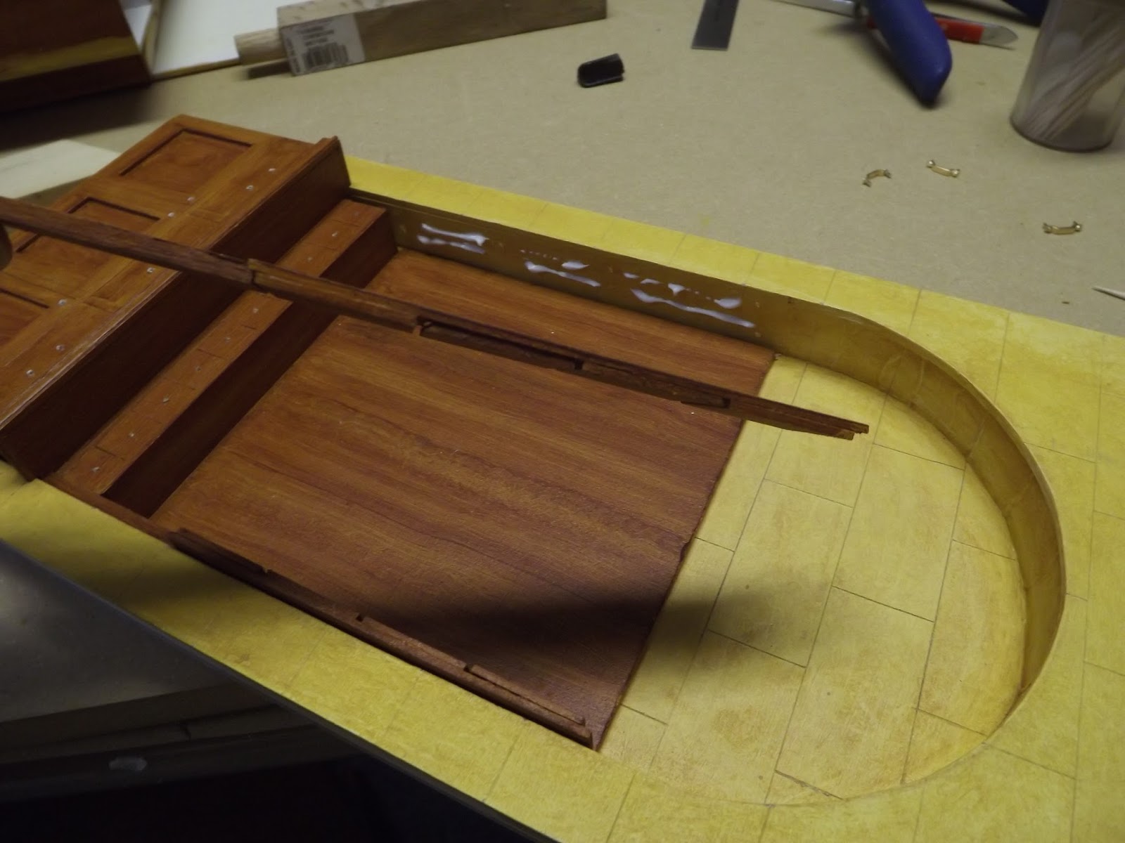 The cooking range and roasting range chimneys arches were made by slowly bending a strip of 2 ply illustration board with wood blocks to hold the strip in place at the right angle. The picture above is the 13 inch one.