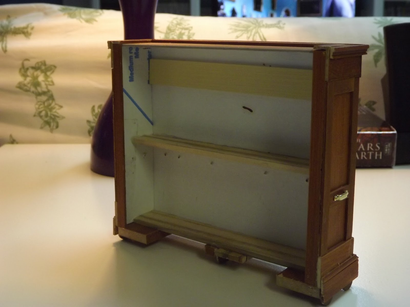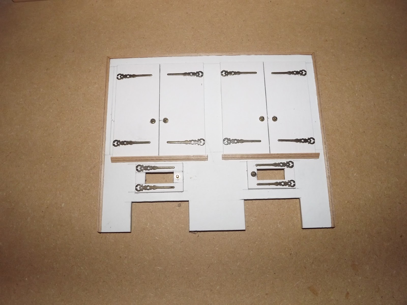 I was dissatisfied with the old butlers pantry. The shelves were made with lumber that was much to thick. It completely ruined the illusion for me, not to mention my wood grain was off because I pre assembled the unit before painting it.. This time around all the shelving in the kitchen was made using 1/16 inches. It made all the difference. Unlike the rest of the storage units which were all glued onto a back piece stuck to the wall, the top of the butler's pantry was made by building the front first.