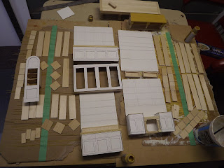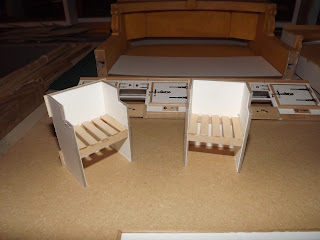 At this point the fireboxes and range were painted with the spray paint separately. I only assembled them after the coal was glued in place. I also built the back wall of the range using 1/16 x 1/16 molding and laminated wall tiles. I spray painted the "Iron" part before installing the tile inserts. In the next picture you also see the doors to the flues which are made of basewood and leftover handles.