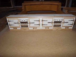 The cooking range, as well as the ovens, were inspired by the kitchen at Audley End house. Again I started with illustration board, molding and clock hands...
