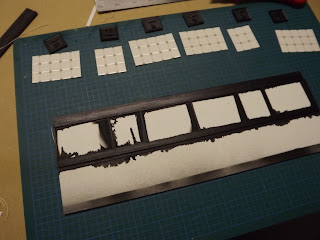 I created arches from the illustration board the same way I made the chimneys. The floor is just painted single ply illustration board done the same way as the walls, but with a 50/50 dark brown wash and a square pattern.