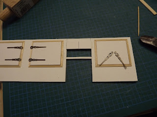 The roasting range was a bit more of a challenge. It is basically a giant grate. I based it on the one at the Royal Pavilion, one of the favorite buildings I've visited. I started by making the arms to hold the spits out of 1/8 x 1/4 inch basewood strips.